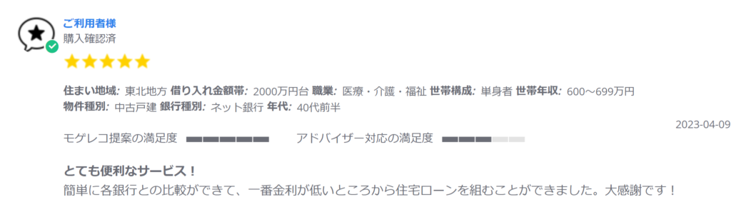 モゲレコの評判としては、おすすめの声が多いようです。一覧表で金利が分かるので、最後に決める時にも納得感を得やすいですね!